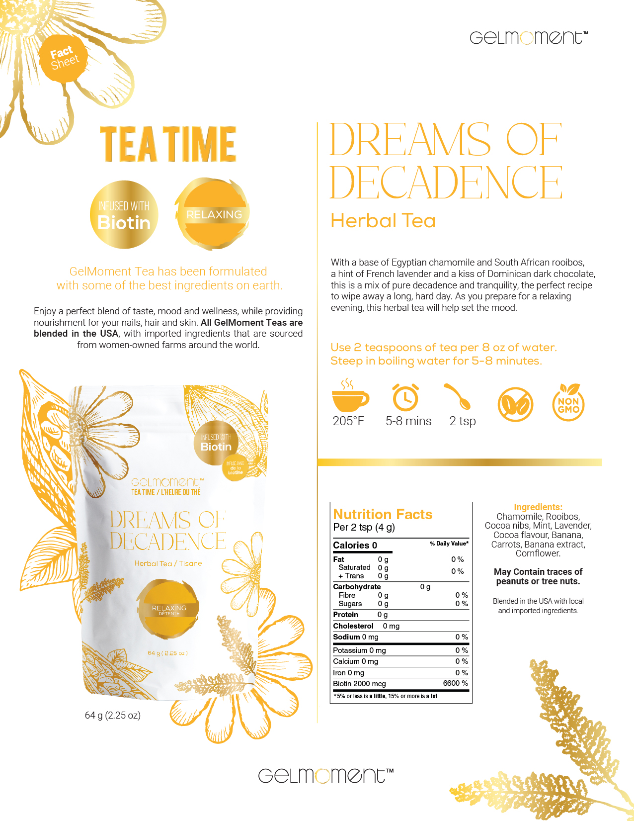 With a base of Egyptian chamomile and South African rooibos, a hint of French lavender and a kiss of Dominican dark chocolate, this is a mix of pure decadence and tranquility, the perfect recipe to wipe away a long, hard day. As you prepare for a relaxing evening, this herbal tea will help set the mood.